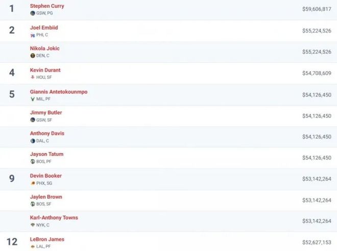 福布斯統(tǒng)計2025年收入最高的十位籃球運(yùn)動員:(均為稅前)