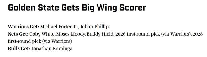 在這種情況下,美媒《SI》結(jié)合勇士隊實際需求,以及目前曝出的各類消息,曬出一筆符合各隊需求的潛在3方交易方案,具體方案如下: