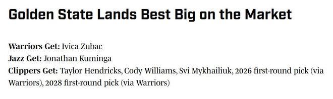快船得到:亨德里克斯+科迪-威廉姆斯+米哈伊柳克+26年勇士首輪+28年勇士首輪。