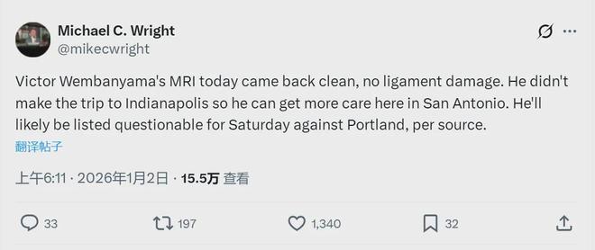 北京時(shí)間1月2日凌晨,據(jù)馬刺隨隊(duì)記者M(jìn)ichael C. Wright報(bào)道,文班亞馬沒(méi)有隨隊(duì)前往印第安納波利斯,而是留在圣安東尼奧接受進(jìn)一步治療,他確定缺席1月3日和步行者的比賽。MRI檢查結(jié)果顯示,文班亞馬沒(méi)有結(jié)構(gòu)性的損傷。