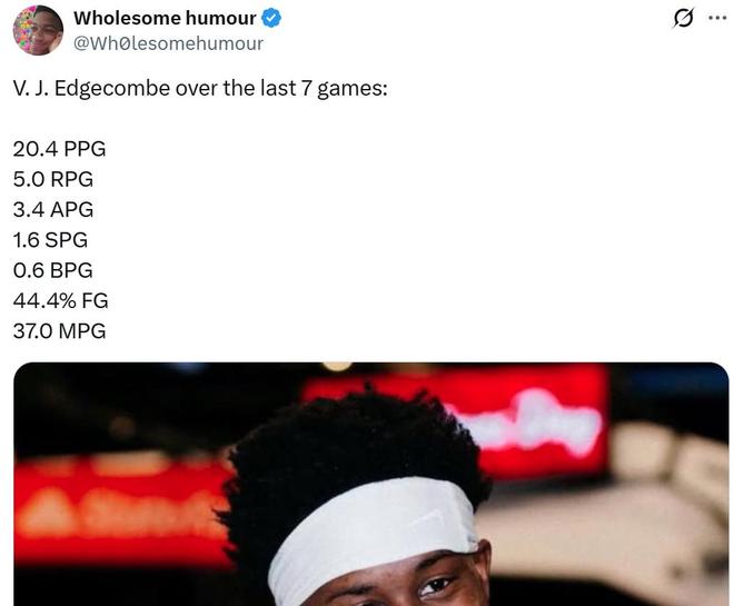 過去7場比賽,埃奇庫姆場均可以拿到20.4分5板3.4助1.6斷0.6帽全能數(shù)據(jù),展現(xiàn)出一名超級新星應(yīng)有的風(fēng)采與潛質(zhì)。