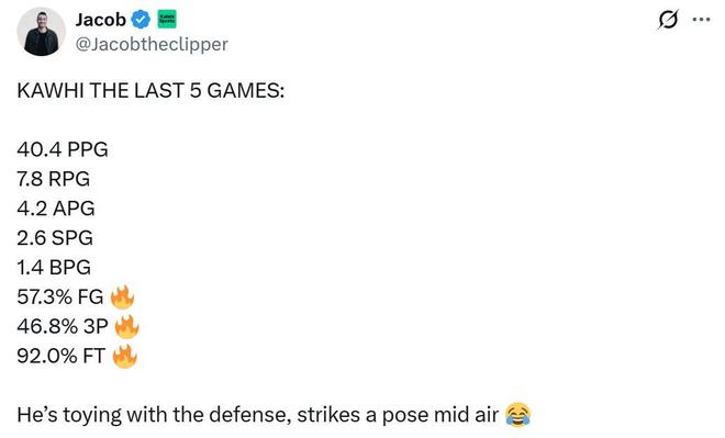 過去5場比賽,小卡合計轟下202分,創(chuàng)造其個人職業(yè)生涯連續(xù)5場比賽總得分新紀錄。