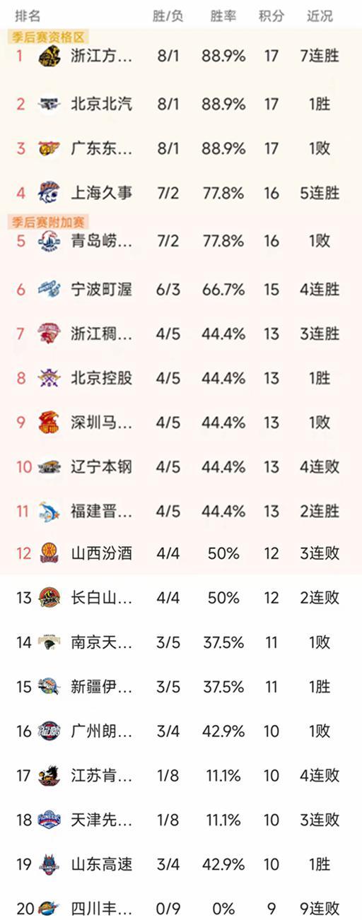 南京和新疆都是3勝5負暫列第14-15,廣州3勝4負暫列第16名,江蘇、天津都是1勝8負,他們沒有任何的競爭力。山東由于只打了7場比賽,3勝4負積10分排名稍微靠后,四川是唯一沒有勝場的球隊,遭遇9連敗墊底!