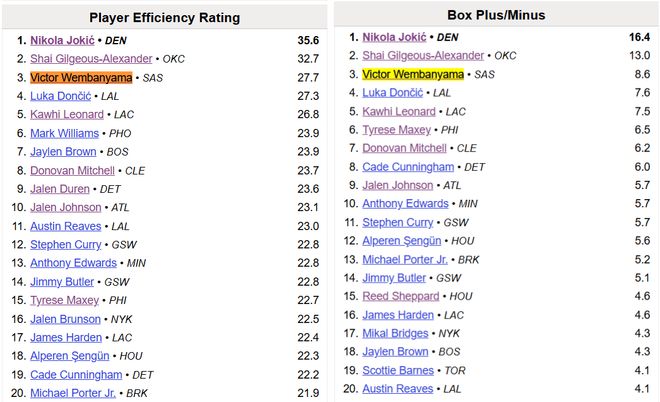高階數(shù)據(jù)方面,文班亞馬本賽季的PER值是生涯最高的27.7,BPM則達(dá)到了+8.6,這兩項(xiàng)全部排在聯(lián)盟第三,僅次于約基奇和亞歷山大,也能說(shuō)明他的表現(xiàn)到底有多好。