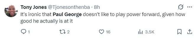 爵士隊記托尼-瓊斯則發(fā)聲:喬治很不喜歡打大前鋒的位置,但他其實打大前鋒的表現(xiàn)明顯更好一些。