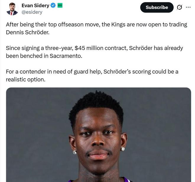 根據(jù)名記Evan Sidery報道,國王隊已經(jīng)正式將施羅德擺上貨架,愿意聽取其他球隊對于他的交易報價。