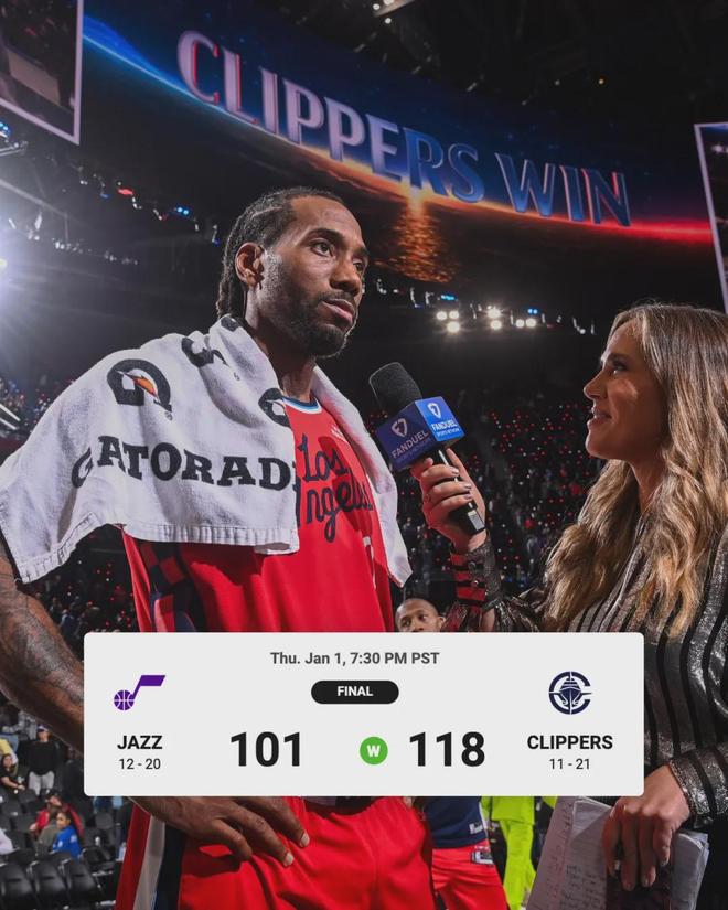 - 2026年01月02日 快船擊敗殘陣爵士迎來6連勝!小卡45+7&末節(jié)20分 哈登20+7