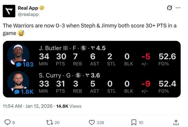 這并不是偶然現(xiàn)象,本賽季巴特勒與庫里均交出30+的三場比賽,勇士隊3戰(zhàn)皆敗。