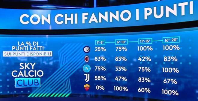 榜首的國米面對前5名球隊的搶分比例只有25%,接連輸給了尤文、AC米蘭和那不勒斯,只贏下了羅馬;面對6-10名球隊的搶分比例則達到75%,因為與第7名博洛尼亞的比賽還沒開踢;而面對11-20名的中下游球隊,國米則保持了100%的拿分比例??偨Y(jié)起來就是強強對話不給力,但穩(wěn)定的虐菜能力保證了國米依然能夠位列榜首!