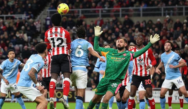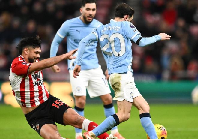 開場(chǎng)不久伯納多-席爾瓦就進(jìn)球了,只可惜因?yàn)樵轿槐淮档?。桑德蘭隨后踢出了非常犀利的反擊。布羅貝伊扛住迪亞斯后單刀射門,但被多納魯馬化解了。福登的傳球失誤讓馬延達(dá)獲得射門機(jī)會(huì),但馬延達(dá)射門踢偏了。哈蘭德有打破僵局的機(jī)會(huì),只可惜他的射門踢得太正。半場(chǎng)比分依然是0-0!曼城上半場(chǎng)控球率高達(dá)64%,但只有可憐的2次射門。而桑德蘭上半場(chǎng)有6次射門,比曼城多了4次。