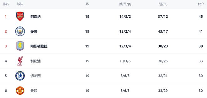 這一輪前3的球隊(duì)命運(yùn)各不相同,導(dǎo)致冠軍爭(zhēng)奪形勢(shì)大變。阿森納這一輪贏球,繼續(xù)鞏固榜首優(yōu)勢(shì)。阿森納45分領(lǐng)跑。而曼城由于戰(zhàn)平,丟掉了關(guān)鍵2分,與阿森納的差距擴(kuò)大到4分,以41分排名第2。第3名的阿斯頓維拉因?yàn)檩斀o阿森納,導(dǎo)致爭(zhēng)冠形勢(shì)迅速惡化,已經(jīng)落后阿森納6分了。