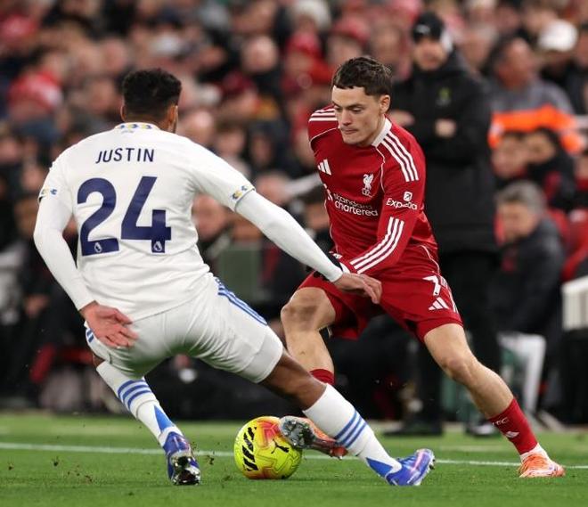 面對(duì)賽季首回合交鋒逼平自己的利茲聯(lián),利物浦此役在主場(chǎng)不敢有絲毫保留,在4231的陣型中,讓阿利森鎮(zhèn)守龍門,羅伯遜、范戴克、科納特和布拉德利構(gòu)筑后防,瓊斯和赫拉芬貝赫搭檔雙后腰,維爾茨、索博斯洛伊和弗林蓬坐鎮(zhèn)中場(chǎng),單箭頭則是埃基蒂克。