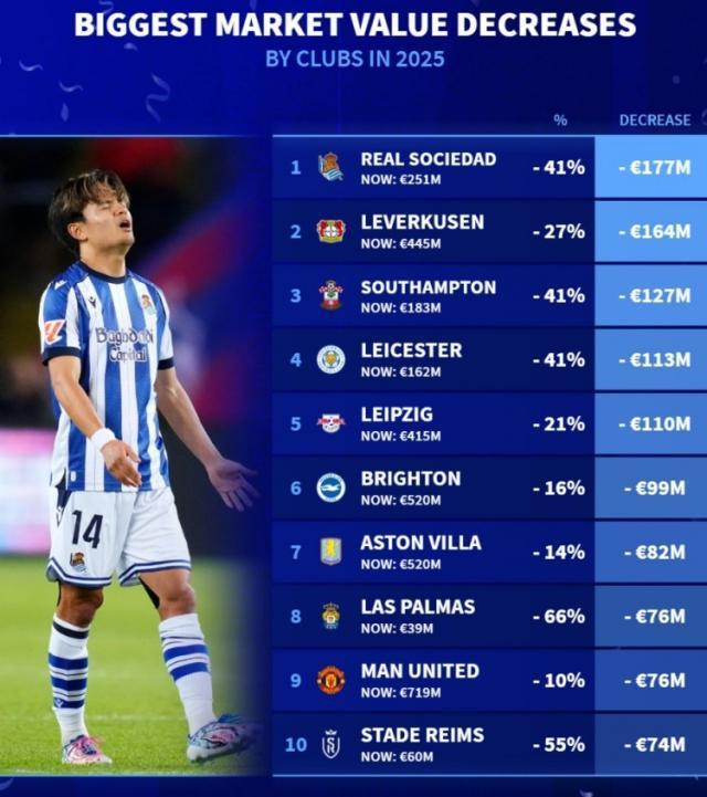2025年已經(jīng)結(jié)束,《轉(zhuǎn)會市場》也統(tǒng)計了年度球隊身價貶值榜,皇社、藥廠分列前二。2025球隊身價貶值榜:歐元