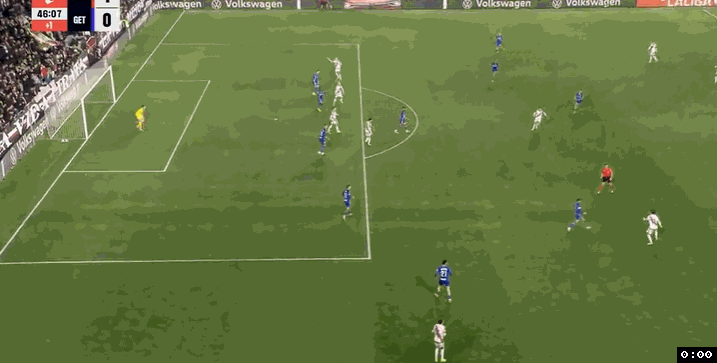 第21分鐘,巴列卡諾禁區(qū)左側(cè)角上任意球機(jī)會(huì),勒戎操刀主罰大力兜射,皮球繞過人墻直奔球門而去,門將索里亞奮力將球擋出。第35分鐘,巴列卡諾前場(chǎng)右側(cè)連續(xù)轉(zhuǎn)移到左側(cè),洛佩茲禁區(qū)角上策應(yīng)直塞,查瓦利亞插上突入禁區(qū)倒三角回傳,瓦倫丁禁區(qū)內(nèi)一步迎球大力抽射,皮球稍稍高出橫梁。上半時(shí)補(bǔ)時(shí)階段,巴列卡諾快速反擊轉(zhuǎn)移到左側(cè),洛佩茲禁區(qū)前沿策應(yīng)接球調(diào)整一步斜吊禁區(qū)右側(cè),后點(diǎn)無人防守的德弗魯托斯迎球凌空怒射,索里亞撲救失誤,皮球彈入網(wǎng)窩,巴列卡諾1:0打破僵局。