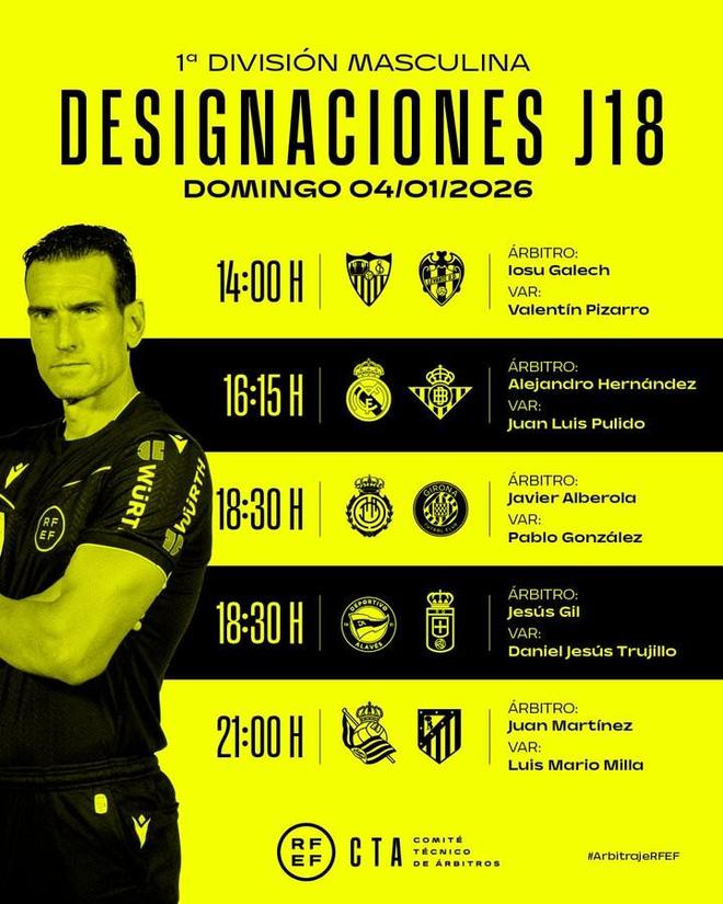 北京時(shí)間1月3日,西班牙足協(xié)官方公布了聯(lián)賽第18輪第3比賽日的裁判名單,平方哥埃爾南德斯執(zhí)法皇馬vs貝蒂斯。
