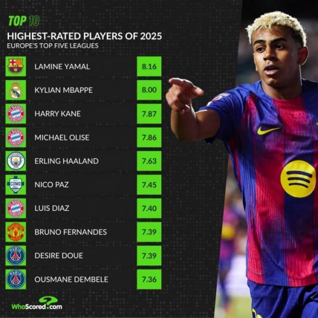 whoscored統(tǒng)計(jì)了2025年五大聯(lián)賽場(chǎng)均評(píng)分榜,亞馬爾力壓姆巴佩居首。whoscored2025五大聯(lián)賽評(píng)分榜: