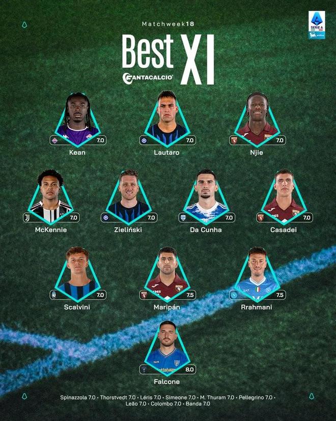- 意甲第18輪最佳陣容:勞塔羅、澤林斯基、麥肯尼入選
